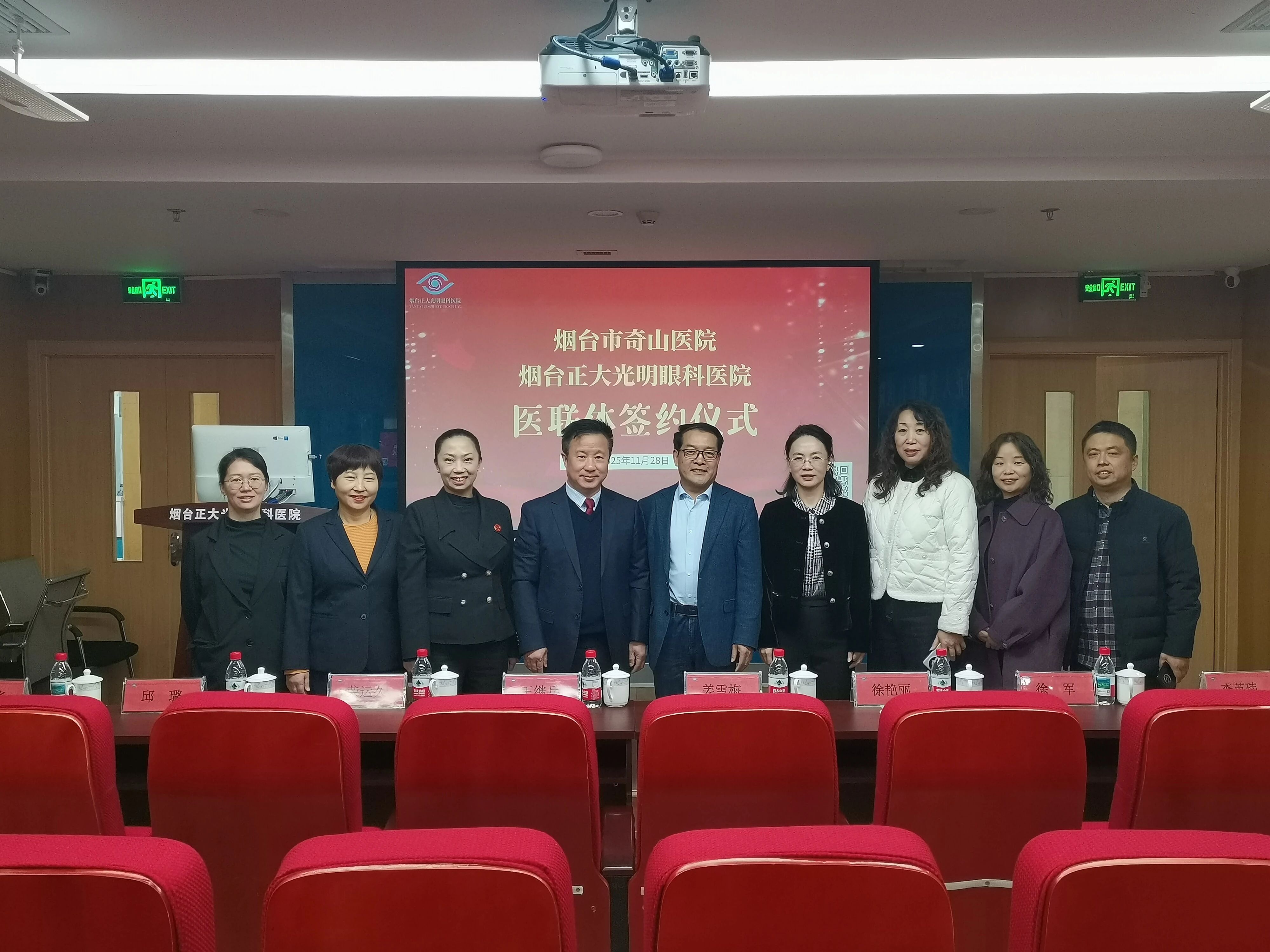 2025年11月28日上午,烟台市奇山医院与烟台正大光明眼科医院医联体签约仪式隆重举行,标志着两家医院正式开启深度合作、资源共享、携手共赢的崭新篇章。奇山医院纪委书记姜雪梅、医务科副科长徐艳丽、健康管理中心主任徐军、公共服务中心主任李英玮,正大光明眼科集团副总院长、烟台正大光明眼科医院院长王继兵,烟威大区副院长荣运久,烟台正大光明眼科医院行政院长邱璐、医务部主任周玉娟、辛安华老师等领导齐聚一堂,共同见证这一关乎区域医疗发展、惠及百姓健康的重要时刻。