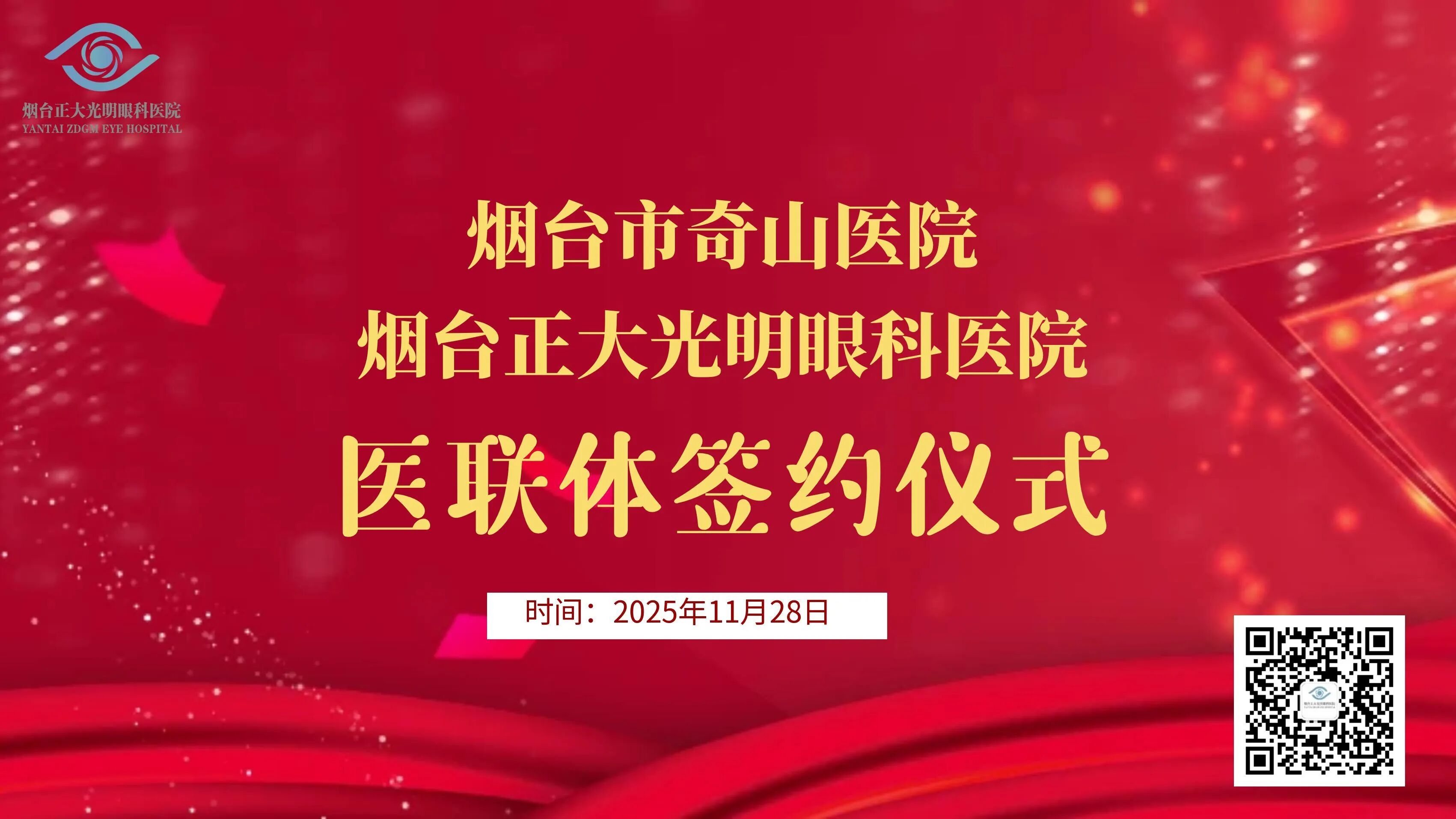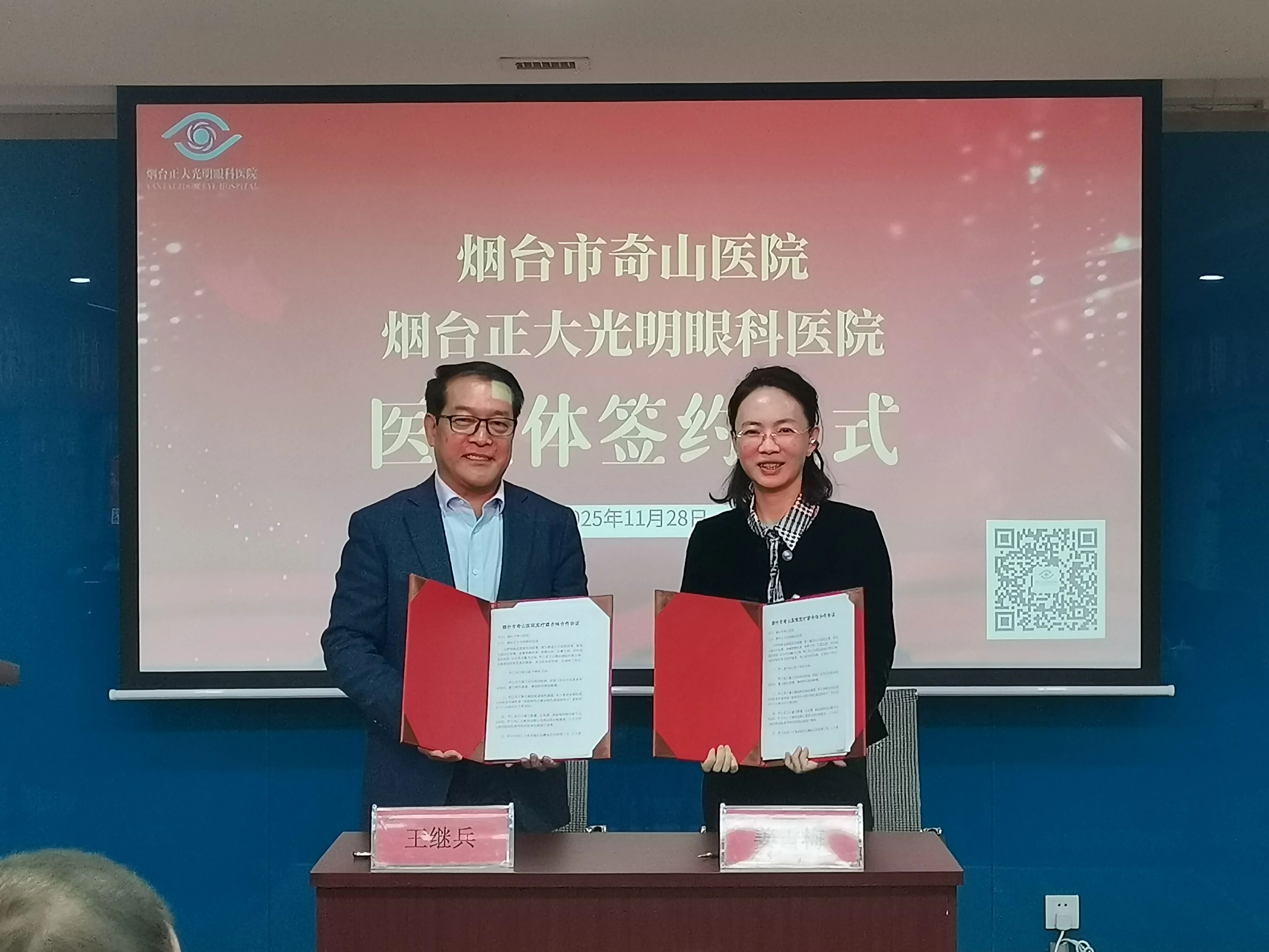 2025年11月28日上午,烟台市奇山医院与烟台正大光明眼科医院医联体签约仪式隆重举行,标志着两家医院正式开启深度合作、资源共享、携手共赢的崭新篇章。奇山医院纪委书记姜雪梅、医务科副科长徐艳丽、健康管理中心主任徐军、公共服务中心主任李英玮,正大光明眼科集团副总院长、烟台正大光明眼科医院院长王继兵,烟威大区副院长荣运久,烟台正大光明眼科医院行政院长邱璐、医务部主任周玉娟、辛安华老师等领导齐聚一堂,共同见证这一关乎区域医疗发展、惠及百姓健康的重要时刻。